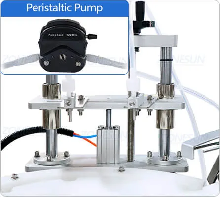 With 2 filling heads operating simultaneously, more containers can be filled in a shorter amount of time. The filling work is controlled by peristaltic pump, liquid being pumped only contacts the interior of the tubing, minimizing the risk of contamination.