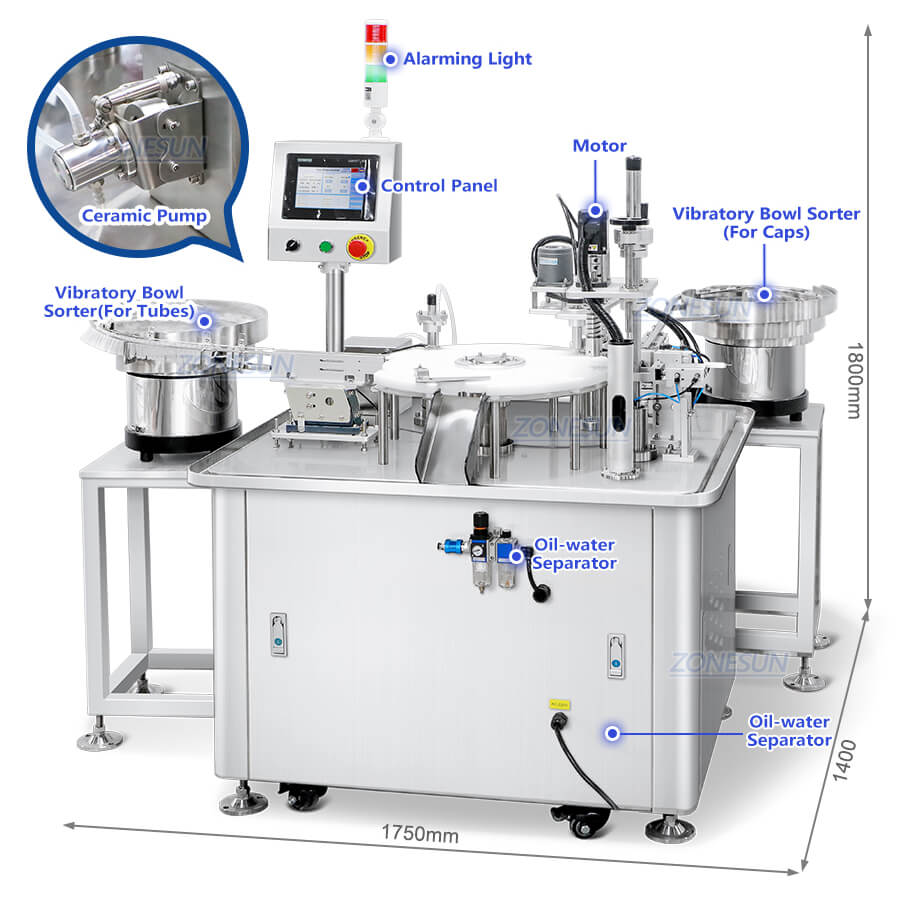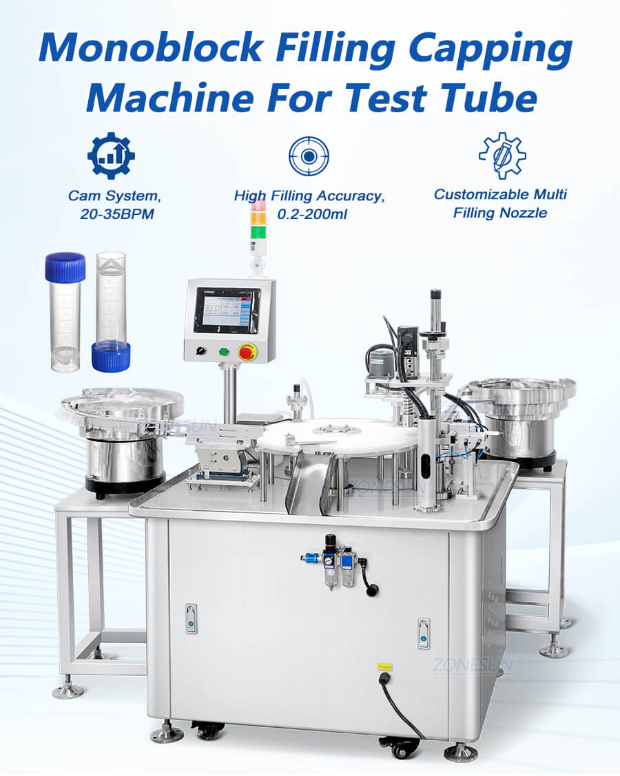 This monoblock machine control work through cam system, it can reach 30BPM, and designed for small volume like liquid solvent.Compact machine body can integrate with bottle labeler to realize automated production.
