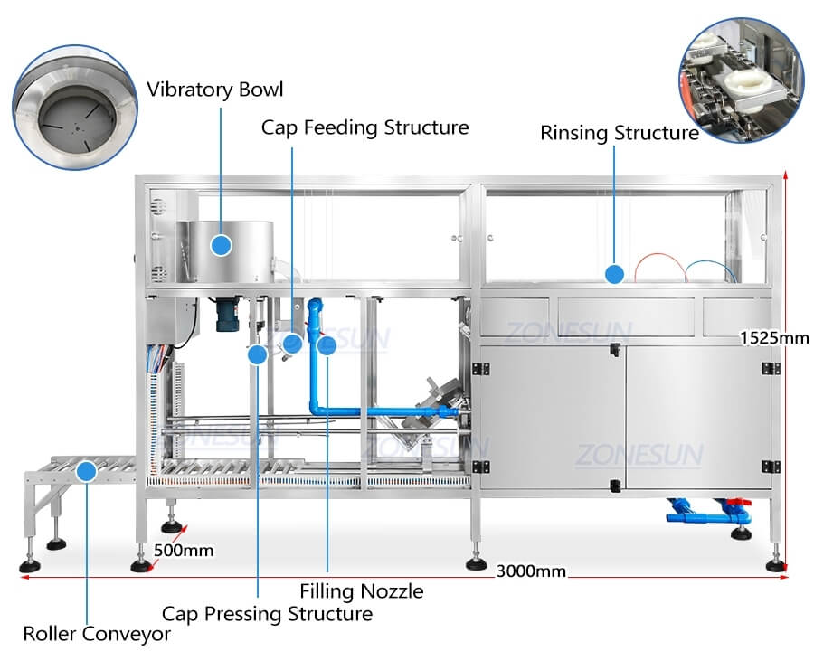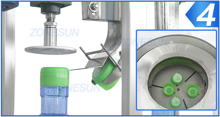 This machine can automatically feed and press caps onto gallon jugs. We can also customize the capping structure to meet your specific needs.
