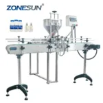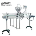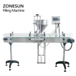 Compared with the horizontal filling machine,this machine is equipped with the conveyor belt,this makes it can work with automatic capping machine and labeling machine.It is suitable for filling liquid and paste like water, milk, juice, honey, lotion, cream etc.